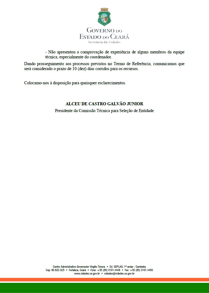 A Comissão Técnica para Seleção de Entidade, instituída pela Portaria nº 295/2016, publicada no Diário Oficial do Estado Série 34, Ano VIII, nº 183, página 10, em 27 de setembro de 2016, no uso de suas atribuições legais, divulga o Resultado Preliminar.