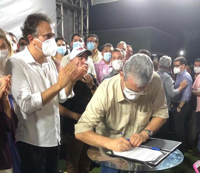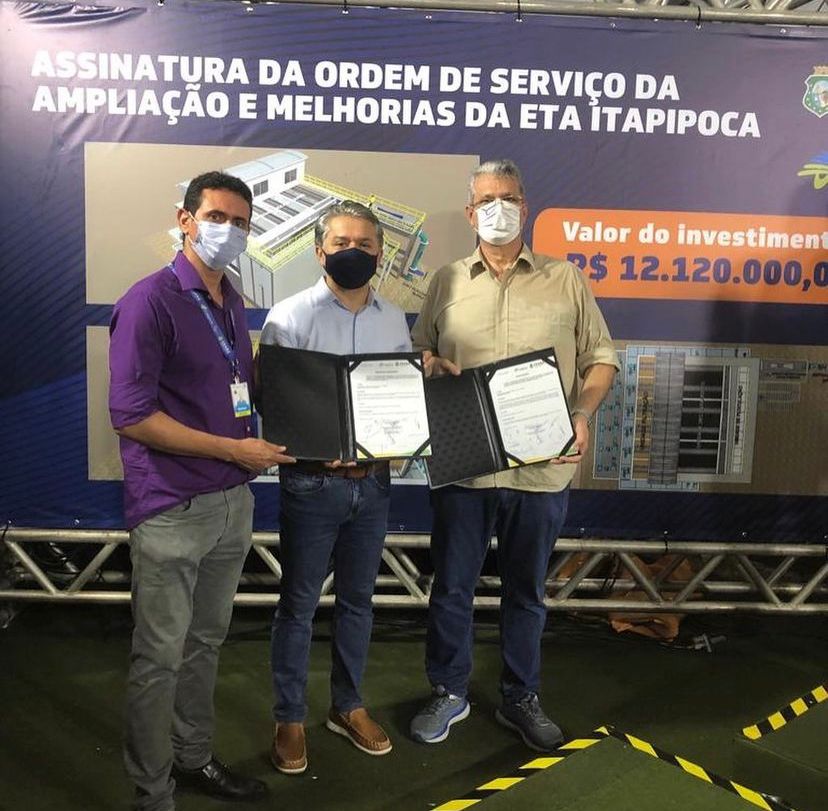 Na noite do último sábado (26), o secretário das Cidades, Marcos Cals, o governador Camilo Santana e o diretor-presidente da Companhia de Água e Esgoto do Ceará (Cagece), Neuri Freitas, assinaram a ordem de serviço para execução das obras de ampliação e melhorias na Estação de Tratamento de Água — ETA, no município de Itapipoca. O investimento total ultrapassa os R$ 20 milhões.