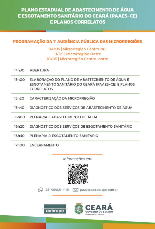 Nos dias 04, 11 e 18 de maio de 2026, a Secretaria da Cidades (SCidades), por meio da Coordenadoria de Saneamento (Cosan), promoverá a 1ª Audiência Pública de elaboração do Plano Estadual de Abastecimento de Água e Esgotamento Sanitário do Ceará (PAAES-CE) e Planos Correlatos.